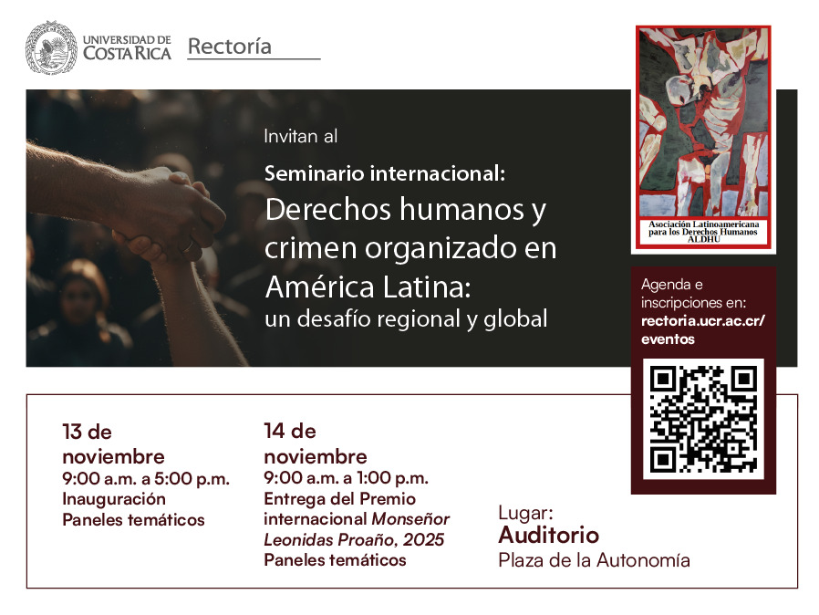 La Universidad de Costa Rica (UCR) y la Asociación Latinoamericana de Derechos Humanos (ALDHU) realizarán los días 13 y 14 de noviembre de 2025 el Seminario Internacional Derechos Humanos y Crimen Organizado en América Latina: Un desafío regional y global, un espacio de alto nivel que convocará a especialistas, autoridades, defensores de derechos humanos y líderes de la región para reflexionar sobre uno de los fenómenos más complejos y urgentes de nuestro tiempo.